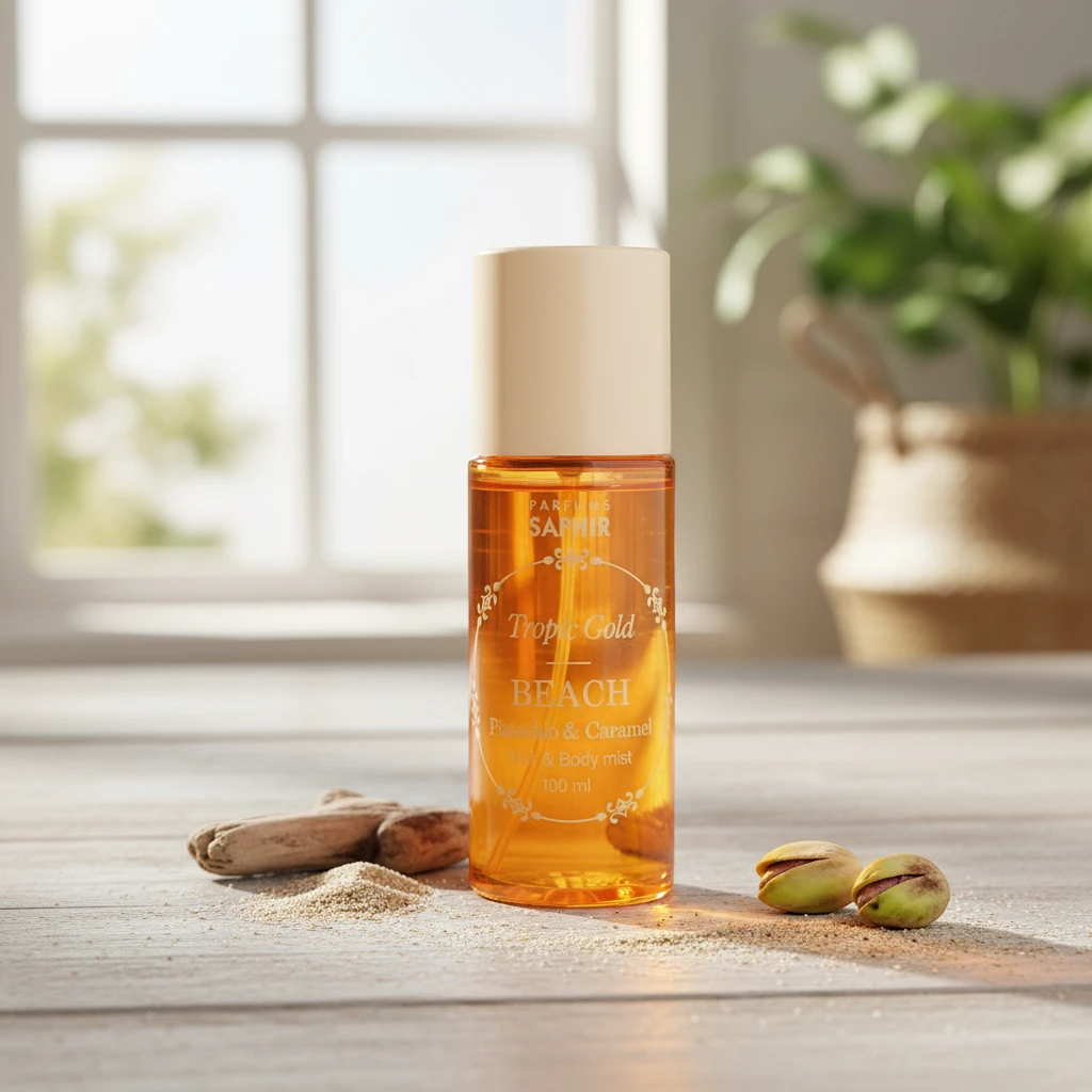 El Tropic Gold Hair & Body Mist Beach es una bruma perfumada de uso dual para cuerpo y cabello. La combinación de pistacho y caramelo da como resultado una fragancia gourmand cremosa y adictiva, dulce sin resultar excesiva.