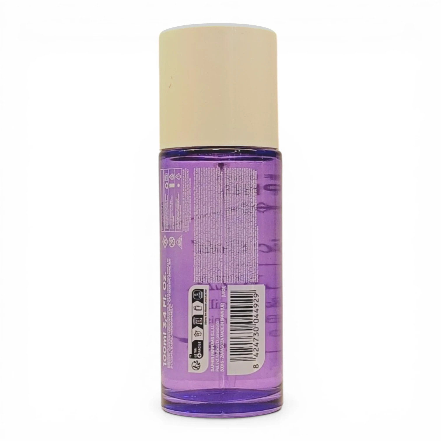 • Frasco transparente de perfume Saphir Paradise Tropic Gold, lleno de líquido amarillo verdoso, con tapón blanco y etiquetado como Pear & Fig, Hair & Body Mist, 100 ml.